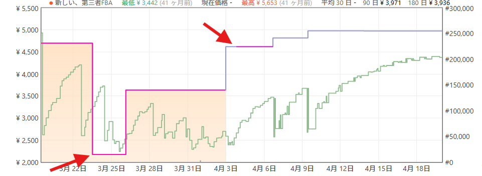 - オレンジ線(Amazonの在庫)が切れた直後に価格が跳ね上がっているかを見る