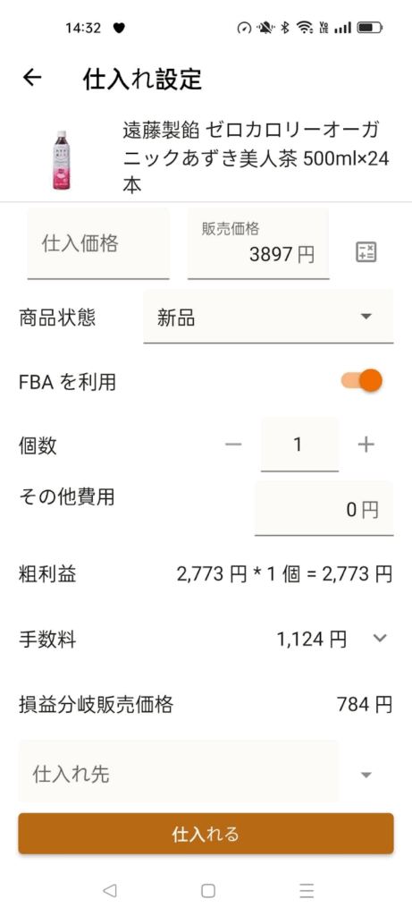 ここをタップすると、仕入れ価格やFBA手数料などを入力する画面が開きます。